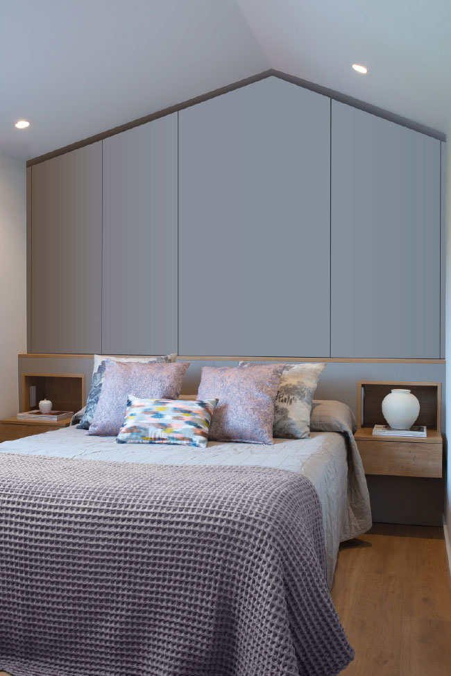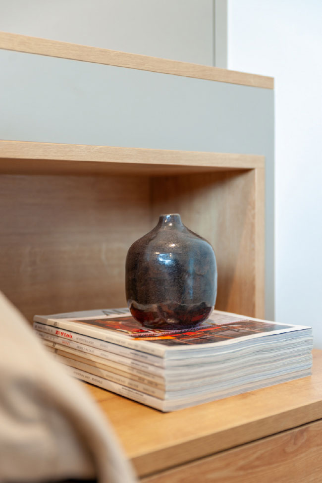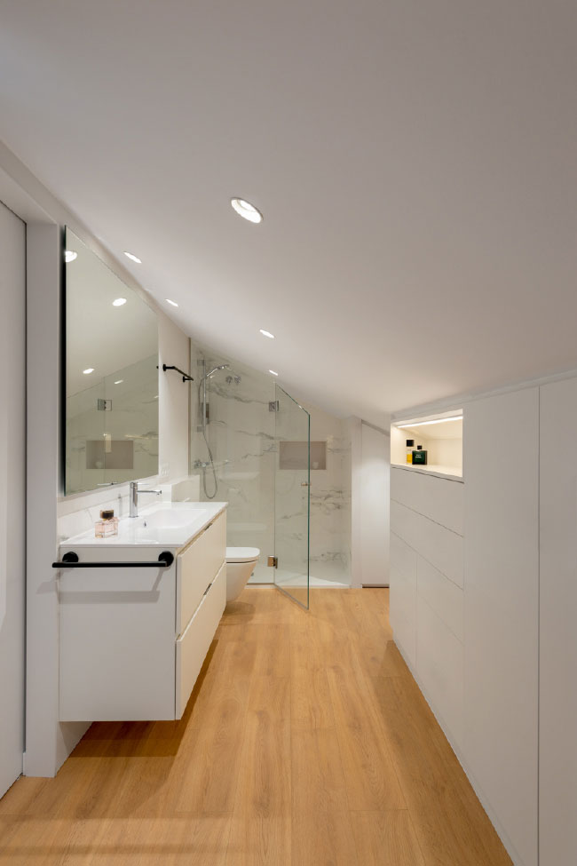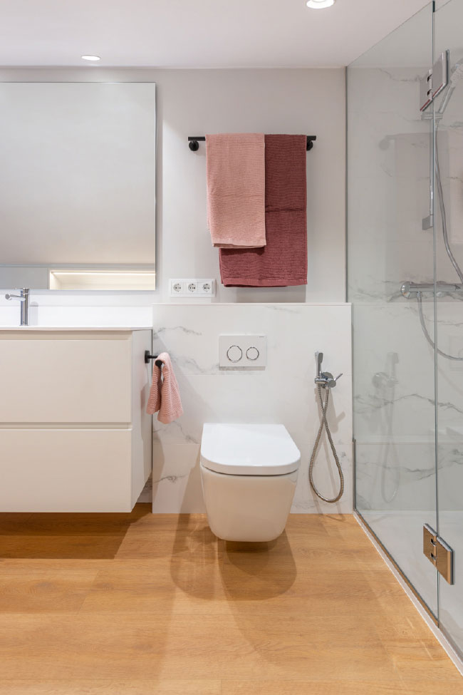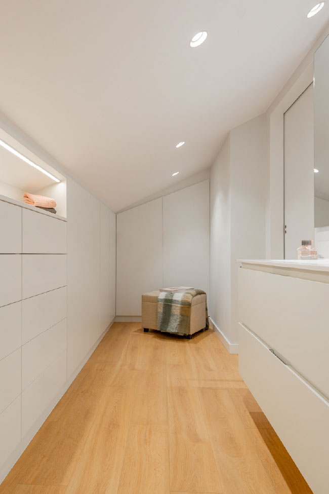 Paral·lelament, vam transformar la suite en un espai de relaxació i intimitat, substituint la banyera per un plat de dutxa funcional i augmentant la capacitat d’emmagatzematge tant al bany com a l’habitació.